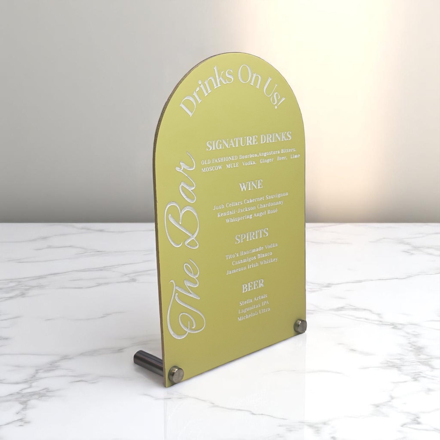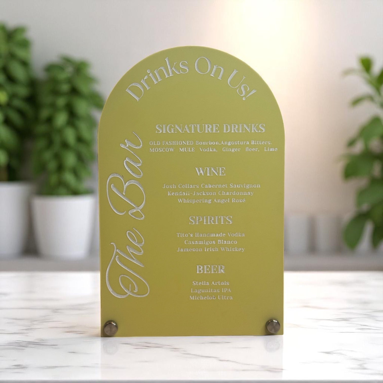 Elevate your event with a custom acrylic bar menu that does more than list drinks—it sets the tone. Each sign is laser-engraved and hand-painted on premium acrylic, then mounted with sleek standoff hardware for a bold display.