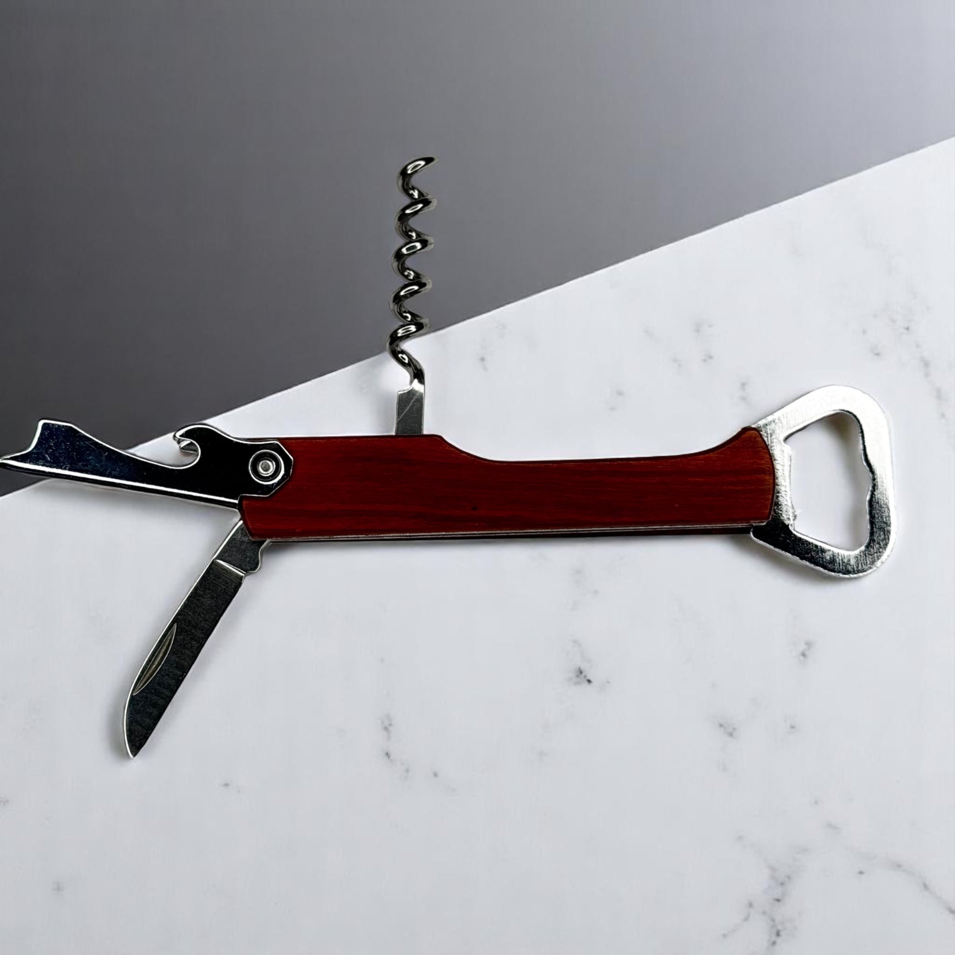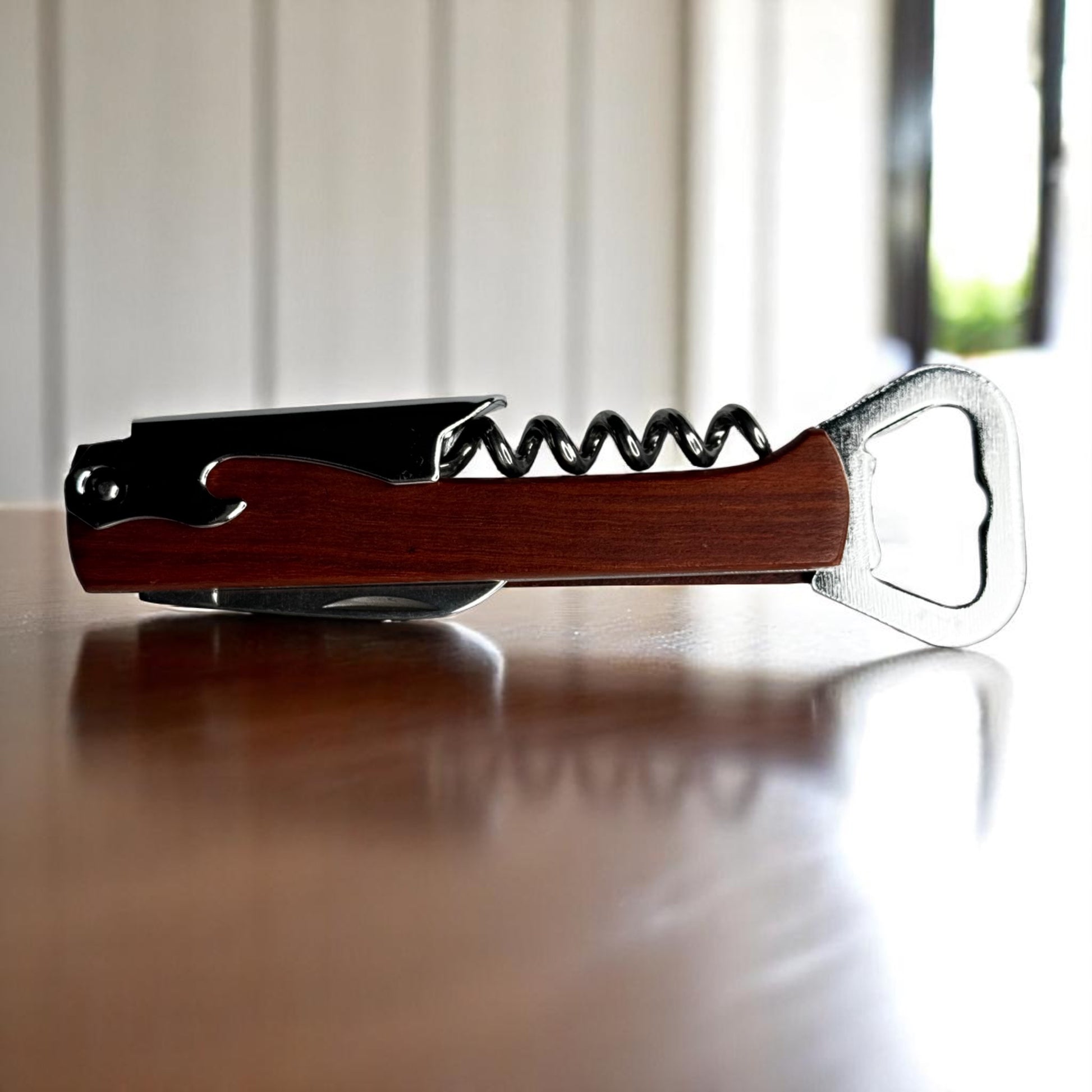 This multifunctional tool combines a reliable corkscrew, a convenient foil cutting knife, and a handy bottle opener.